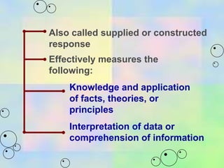 Completion and short answer items measure knowledge, application of facts, theories, and principles by having students answer fill-in-the-blank or short answer questions. They can be easy to write but time consuming to score due to subjective nature of scoring and possibility of unintended responses. Scoring issues include partially correct answers, spelling errors, and determining credit for answers that are right but not what teacher intended.