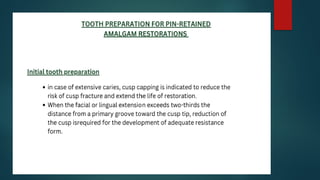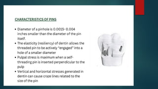 #8 The use of pins may be considered for a tooth that has insufficient enamel present for acid etching or insufficient remaining tooth structure for adequate retention features