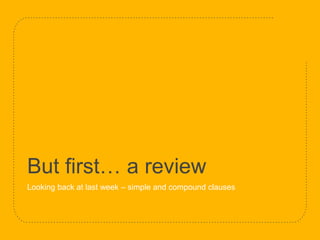 The document provides a comprehensive overview of sentence types in English, including simple, compound, complex, and compound-complex sentences. It explains the structure of clauses, both independent and dependent, and outlines common mistakes in sentence formation such as comma splices and fragments. Additionally, it discusses the use of subordinators and examples to illustrate the differences in sentence structures.