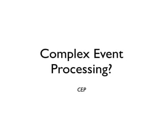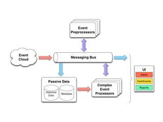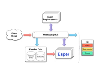This document provides an overview of complex event processing (CEP) and Esper, an open source CEP engine. It defines CEP as analyzing and controlling interrelated events to understand modern distributed systems. Esper makes it easier to build CEP applications by providing an event processing language (EPL) to define event types, continuous queries, and event patterns similar to SQL. It supports features like filtering, aggregation, windows, correlations, and pattern detection on streaming event data. While powerful, Esper has limitations around memory usage, resilience, and distribution that must be considered.