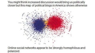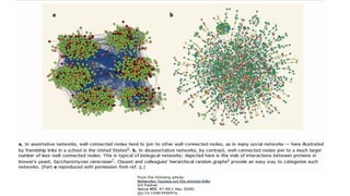 The document discusses assortativity and dissortativity in complex networks. It defines assortativity as "nodes with similar degree connect preferably" and dissortativity as "nodes with low degree try to connect with highly connected nodes." Several studies are summarized that examine assortativity in social networks like Twitter. Happiness was found to be assortative in Twitter reciprocal reply networks. Distance from one's typical location on Twitter was also found to correlate with expressed happiness levels. Assortative networks are described as being more resilient to attacks while disassortative networks are more vulnerable.