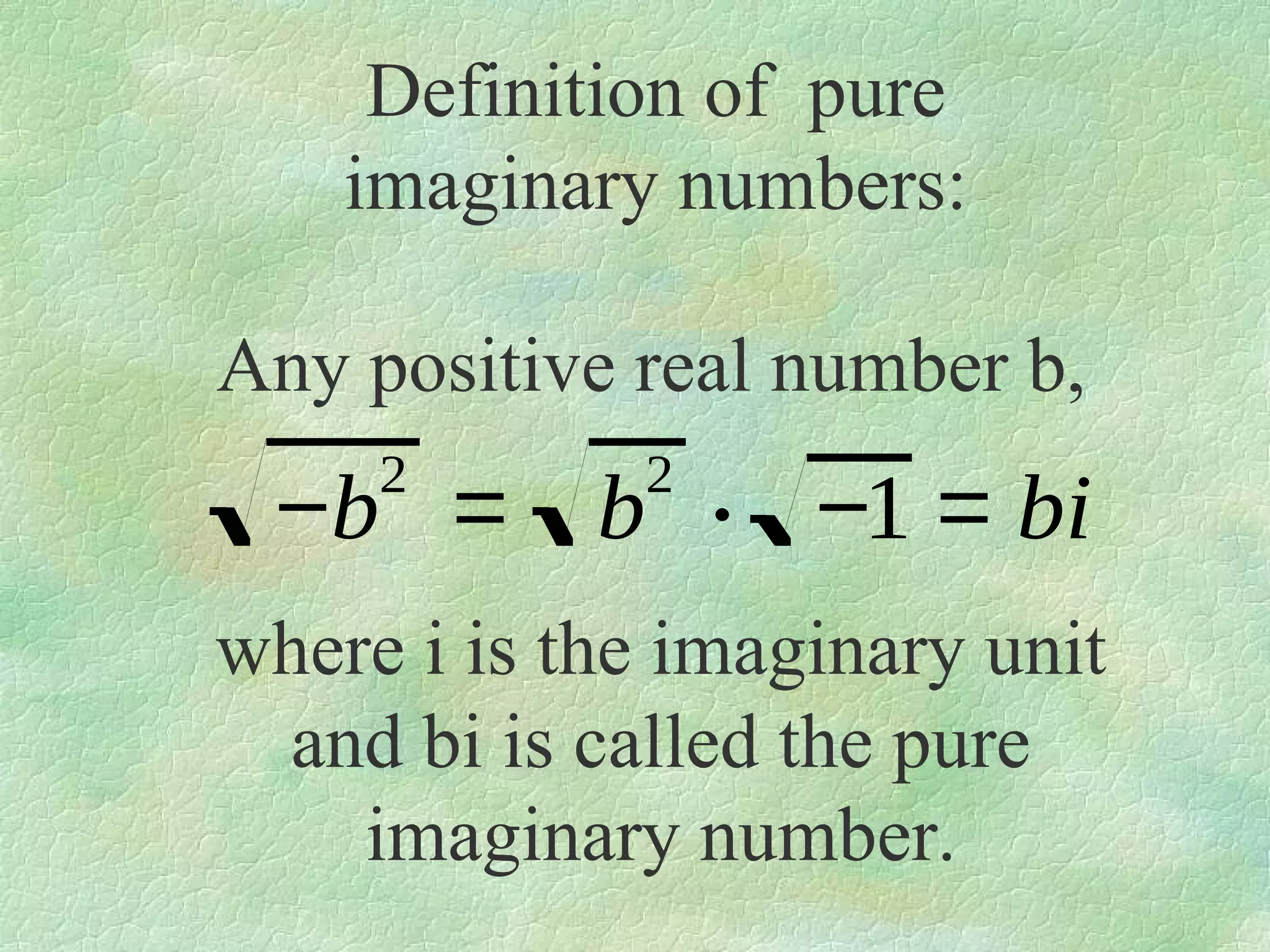 The document discusses complex numbers. It begins by defining pure imaginary numbers as any positive real number b multiplied by the imaginary unit i, where i^2 = -1. It then defines i as the square root of -1. The document proceeds to simplify various expressions involving complex numbers. It introduces the concept of a cycle of i where the value repeats every 4 exponents. It defines complex numbers as numbers in the form a + bi, where a and b are real numbers. The document concludes by showing how to add, subtract, and multiply complex numbers by distributing like terms.