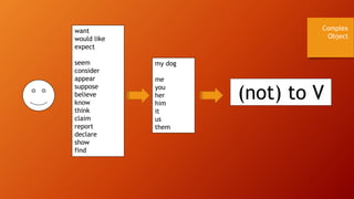 The document provides examples of complex objects in Russian sentences. A complex object is a clause or phrase that serves as the direct object of a verb. The examples show various verbs taking complex object clauses, including "want", "believe", "see", "hear", and "make". They demonstrate complex objects using pronouns like "me", "you", "him", and "them". The document also distinguishes between imperfective and perfective verb aspects in the complex object clauses.