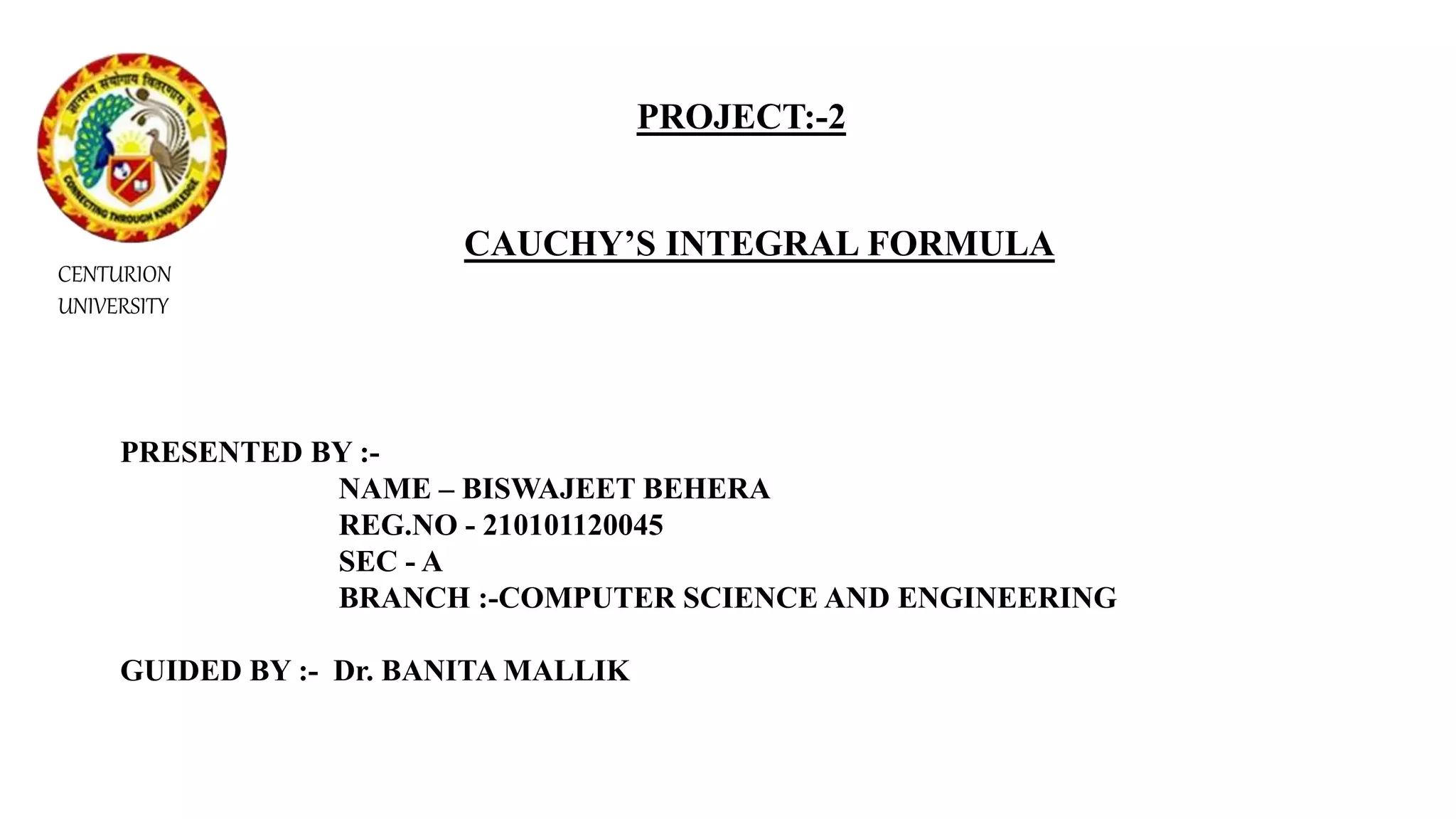 Cauchy's integral formula states that if a function f(z) is analytic within and on a simple closed contour C enclosing a point z0, then the contour integral of f(z) around C equals 2πi times the value of the function at z0. The formula can be used to evaluate the value of an analytic function at a point inside the contour by integrating the function around the contour and dividing by the difference between the point and the integration variable. An example demonstrates applying the formula to evaluate the contour integral of the function z/(z2+1) around the unit circle.