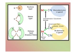 The document discusses the different types of bonding forces that can be operative in complex formation, including van der Waals forces, hydrogen bonding, charge transfer interactions, ion pairing, and hydrophobic interactions. It provides examples of each type of interaction and how they contribute to complex stability. Monodentate and polydentate ligands are described as well as their role in chelation and forming stable metal complexes.