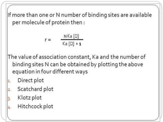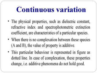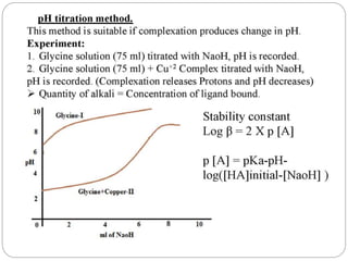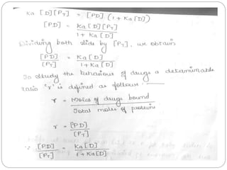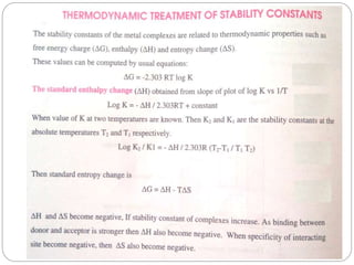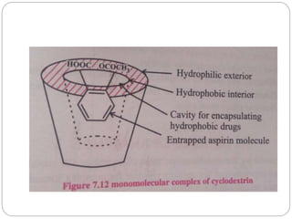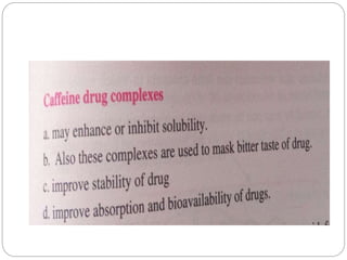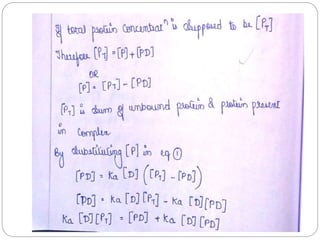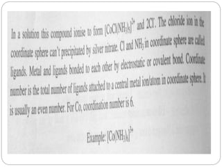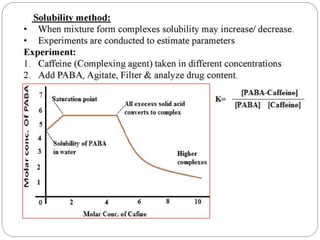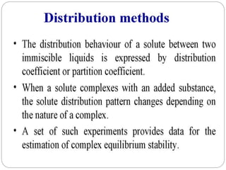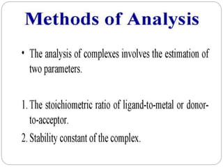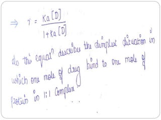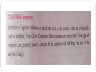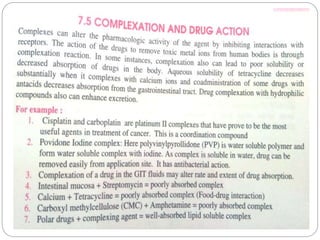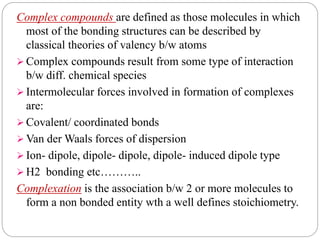 Complex compounds are formed from interactions between different chemical species and have various applications in pharmacy, including improving drug stability, solubility, and bioavailability. The document discusses the types of complexes, such as metal complexes and organic molecular complexes, along with their uses in drug formulation and toxicity reduction. It also covers the significant role of protein-drug binding in drug distribution, metabolism, and action.