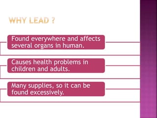 This document discusses the use of 1,2-Bis(N’-benzoylthioureido)benzene (BBTB) as an ionophore for detecting lead cations. Experimental studies using UV-Vis spectrophotometry showed that BBTB forms a 2:1 complex with lead, indicated by a breakpoint in the absorbance versus concentration plot. Theoretical DFT studies calculated binding energies and optimized structures, confirming complex formation between BBTB and lead cations. Overall, BBTB was found to selectively bind lead cations, demonstrating its potential as a selective ionophore sensor for lead quantification.