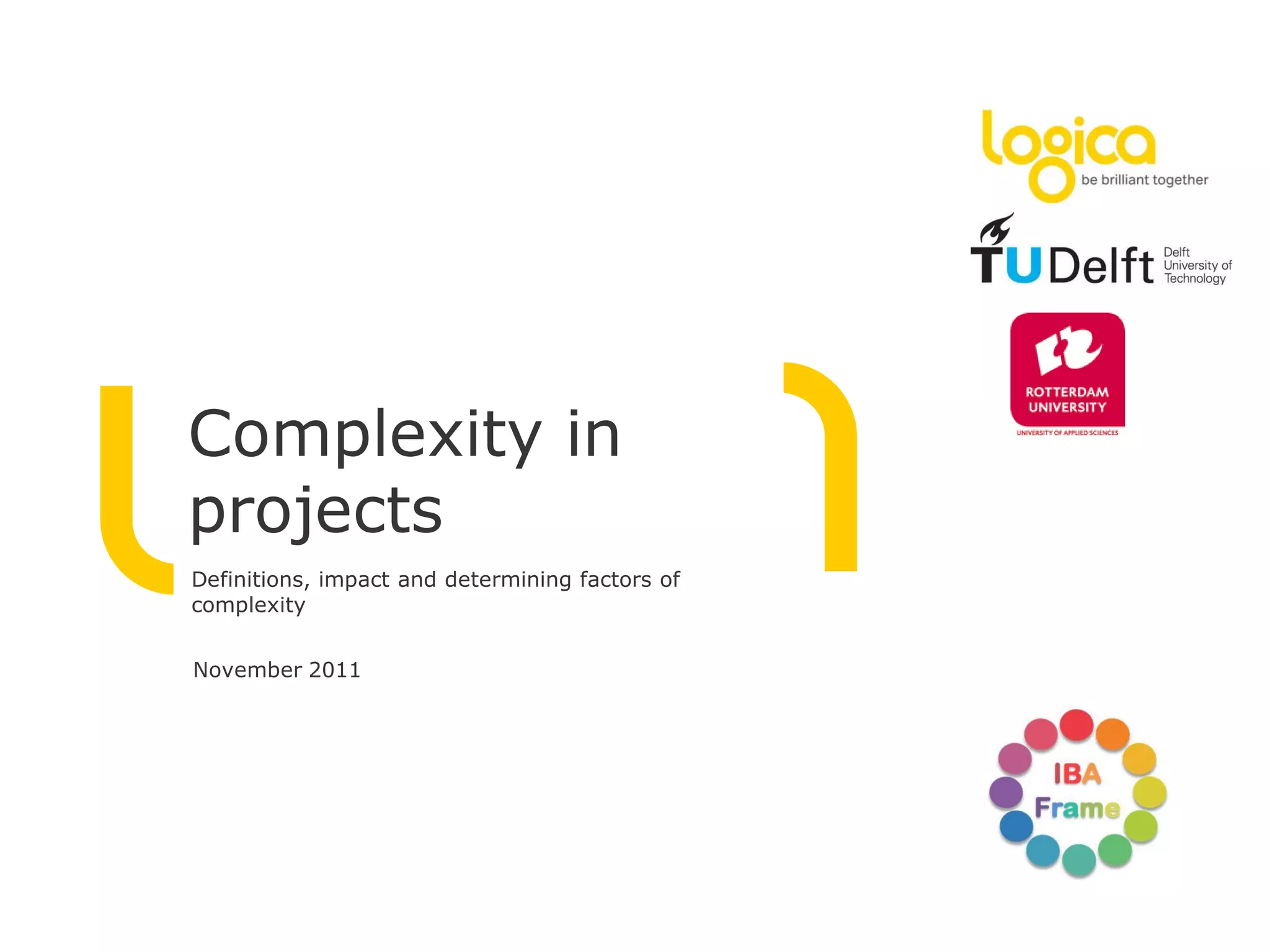 The document discusses the impact of complexity on project outcomes, drawing from studies of 46 and 8 IT-related projects assessing the relationship between complexity and project results. It identifies that complexity is often poorly assessed, leading to significant negative effects on project success, especially as project size increases. Key findings highlight the importance of managing communication, realism, and engagement to effectively handle project complexity.