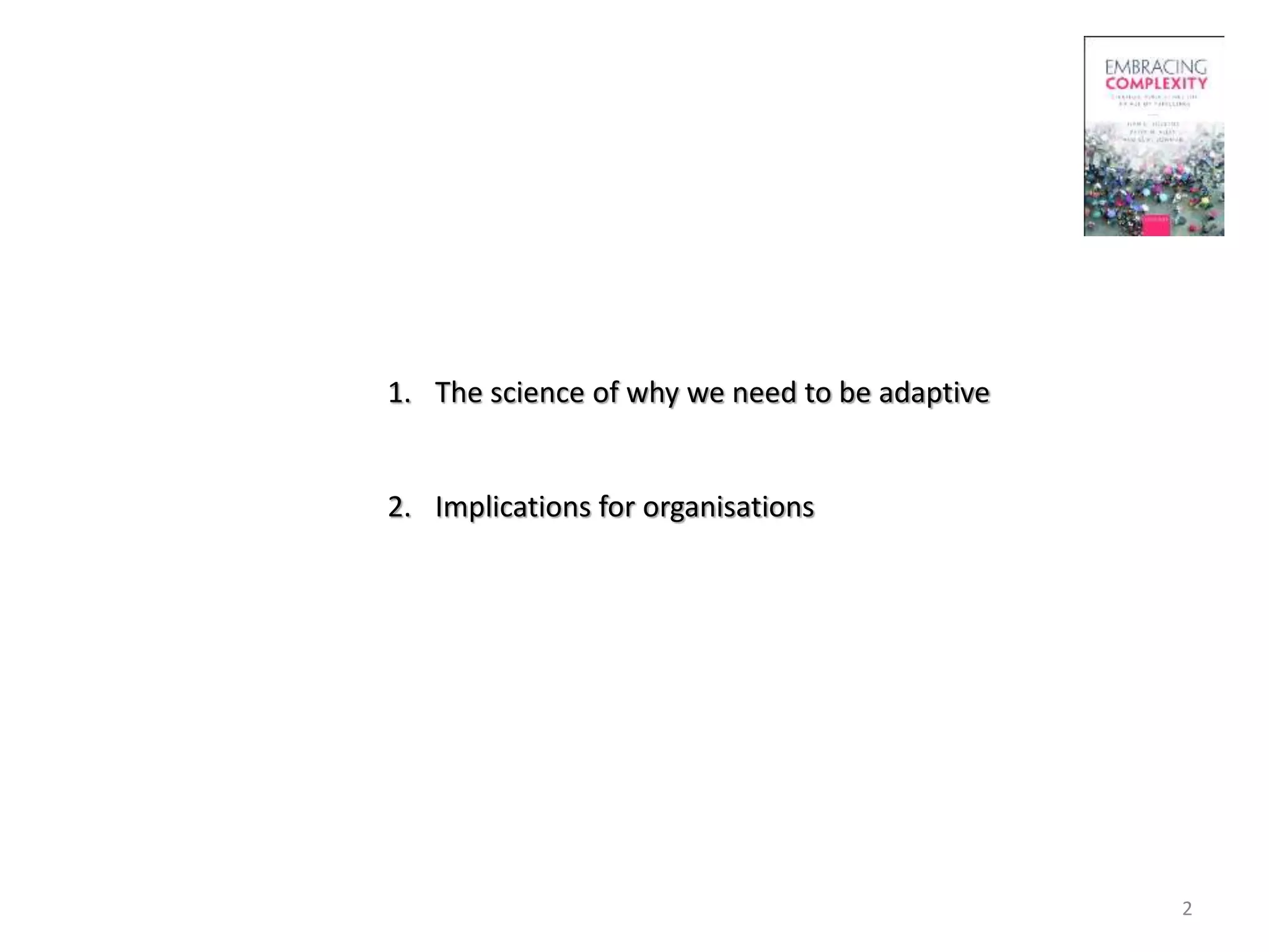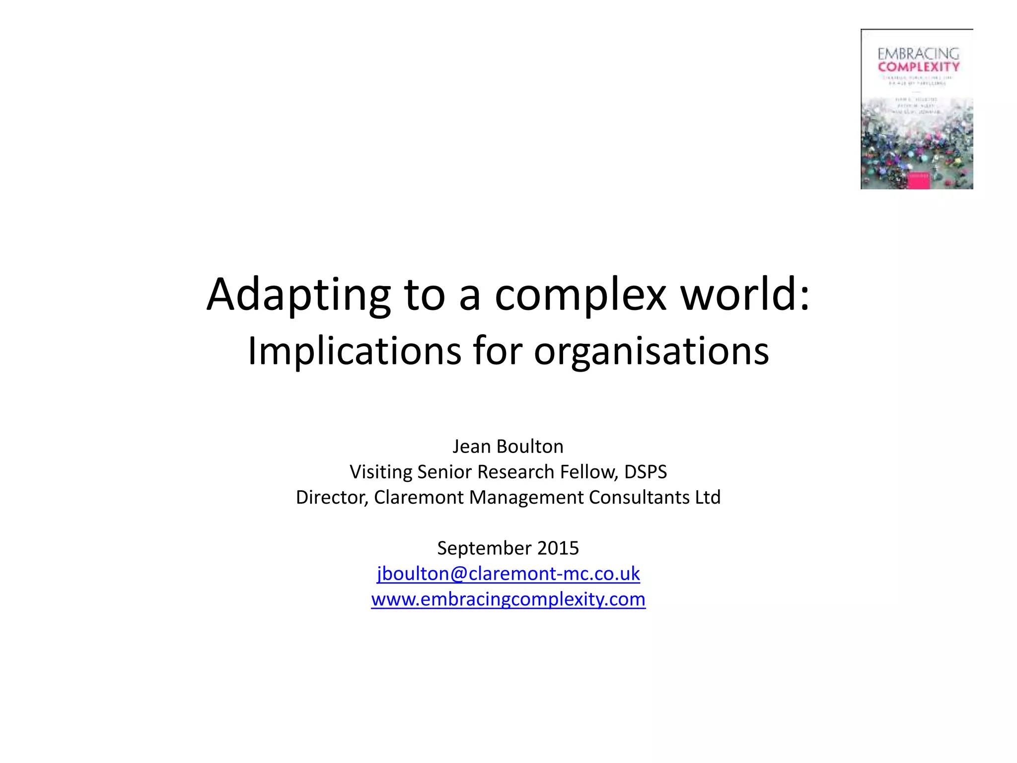 This document discusses adapting organizations to a complex world based on principles from complexity science. It argues that organizations need to (1) undertake ongoing context analysis by looking widely at past, present, and future factors from macro to micro levels (2) be adaptive but not just reactive by experimenting, learning from sharing results, and allowing local interpretation within broad guidelines. While embracing complexity requires a difficult mindset change from wanting a predictable world, it can lead to greater effectiveness if organizations act congruently with the reality of complexity rather than trying to control a system that does not exist.
