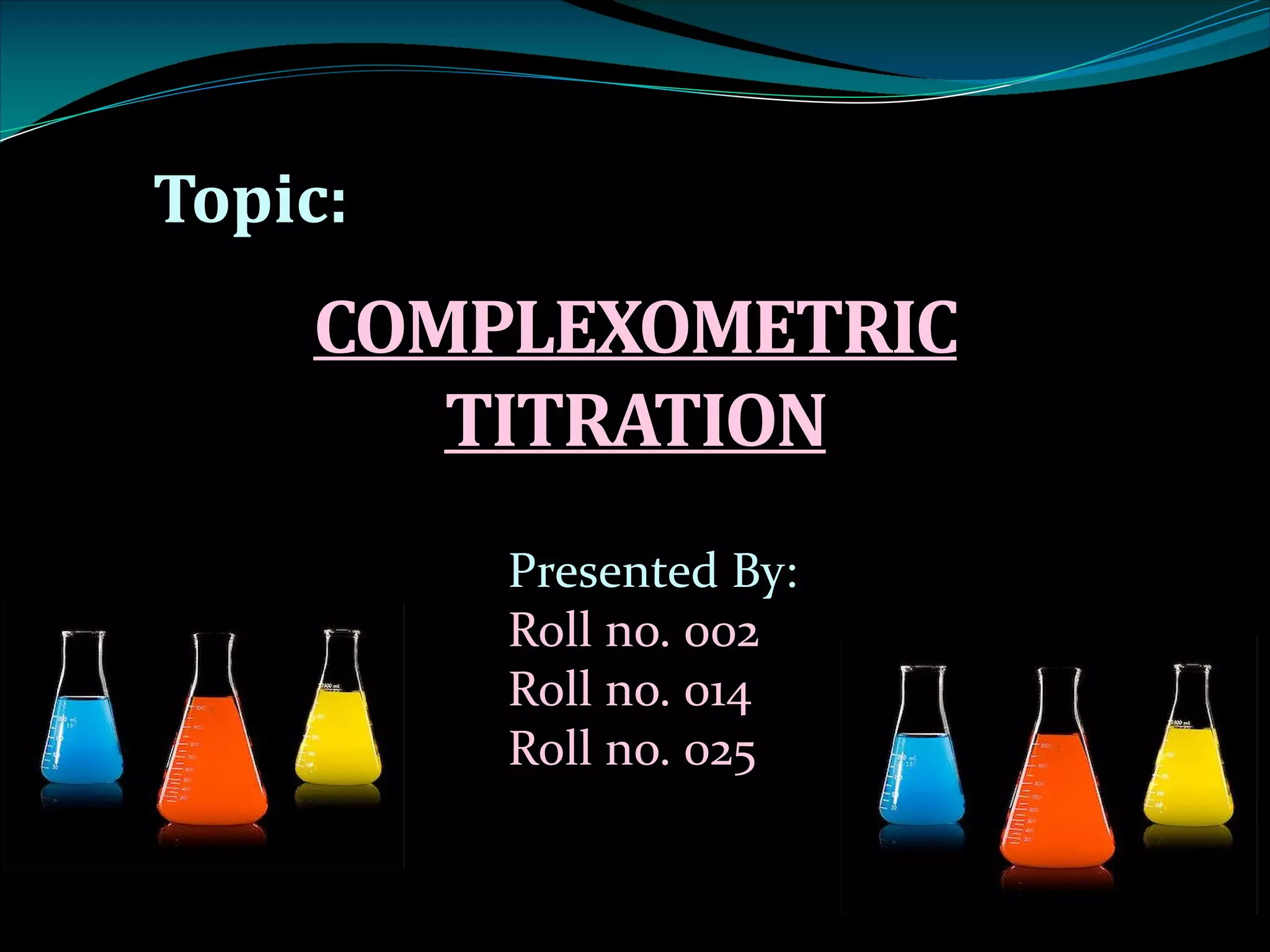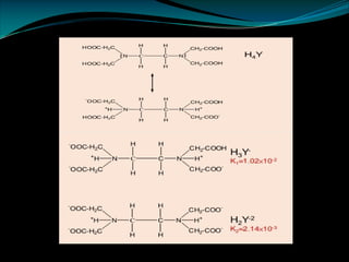 Complexometric titrations involve the titration of a metal ion with a complexing agent or chelating agent such as EDTA. EDTA is a hexadentate ligand that forms very stable 1:1 complexes with metal ions. It is often used as the titrant in complexometric titrations due to the stability of the metal-EDTA complexes formed. The endpoint of the titration can be detected using metallochromic indicators that change color when the metal ion is completely bound to EDTA instead of the indicator. Complexometric titrations have many applications such as determining water hardness and analyzing metals in pharmaceuticals, cosmetics, urine and other samples.