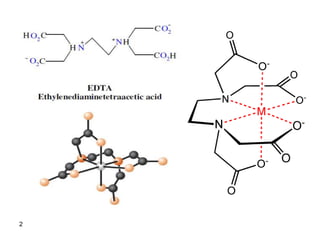 The document details the principles and applications of EDTA titrations, emphasizing its role as a chelating agent for complexometric titrations of divalent and polyvalent metal ions, with a stoichiometry typically of 1:1. It discusses the formation constants of EDTA complexes, the effect of pH on titration curves, and the use of indicators in these titrations, along with several practical examples and calculations. Overall, this document serves as a comprehensive guide on the methodologies and chemical dynamics involved in EDTA titrations.