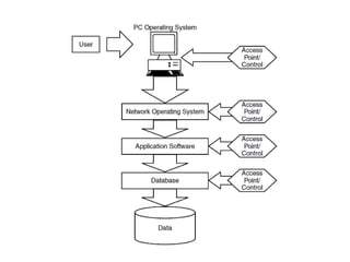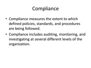 Compliance measures adherence to defined policies and procedures through auditing, monitoring, and investigating at multiple organizational levels. Level one focuses on component owners ensuring appropriate access controls. Level two involves auditing functions assessing internal controls. Level three is the security team responsible for organization-wide implementation of security. Effective compliance requires coordination across these levels.