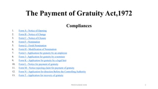 The document outlines various labor laws in India, including the Payment of Gratuity Act, Building and Other Construction Workers Act, Contract Labour Act, and several others, specifying their compliance forms and applicability. It emphasizes requirements for different establishments employing ten or more workers, covers professional tax, maternity benefits, and employee compensation regulations. Additionally, it details specific forms necessary for compliance with each act and outlines exemptions and the applicability of these regulations across different states.