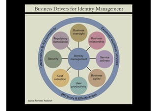 The document discusses identity and access management (IAM) and its relationship to cloud computing. IAM is the process of managing digital identities and access privileges for users, systems, and services. When using cloud computing, an organization relinquishes control over infrastructure but gains flexibility, scalability, and reduced costs. IAM becomes especially important in the cloud to ensure security, privacy, and compliance through features like authentication, authorization, and audit tracking across multiple cloud applications and services.