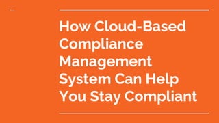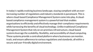 A cloud-based compliance management system provides organizations with an efficient means to meet compliance requirements, leveraging cloud technology for scalability, accessibility, and security. Key benefits include enhanced collaboration, real-time reporting, automation of compliance tasks, and timely legal updates which allow for better decision-making and reduced risk of non-compliance. These systems transform the way companies manage compliance by offering centralized data, cost-effectiveness, and improved efficiency in a digitally secure environment.