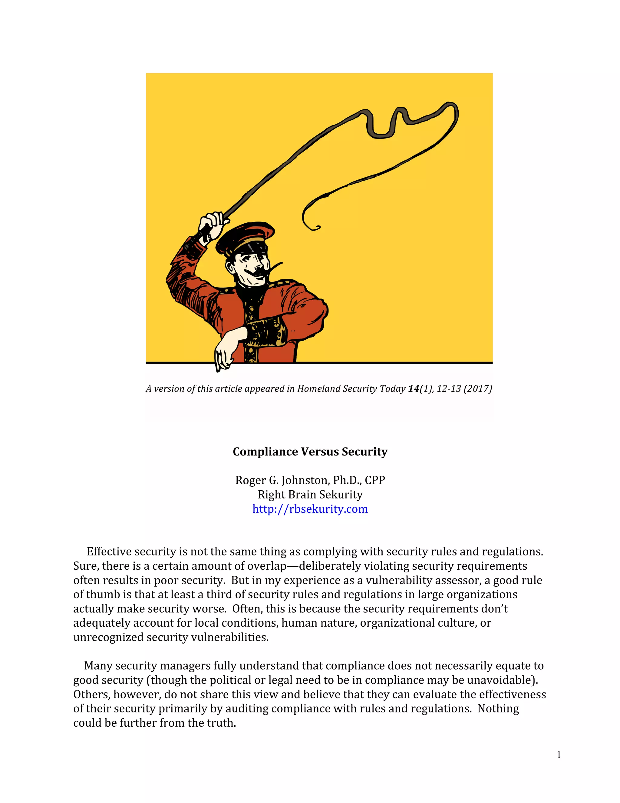 Este artículo discute la diferencia entre cumplimiento de normas de seguridad y la efectiva seguridad, argumentando que muchas regulaciones pueden perjudicar la seguridad al no considerar factores locales y culturales. Se ofrecen ejemplos de cómo el cumplimiento crea una cultura cínica hacia la seguridad, disuade la responsabilidad personal y limita la innovación. Destaca que la seguridad efectiva debería enfocarse en la transparencia y la adaptabilidad en lugar de en la burocracia y el cumplimiento mínimo.