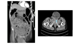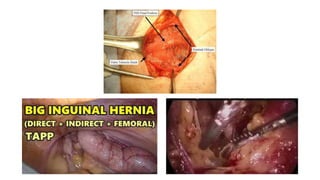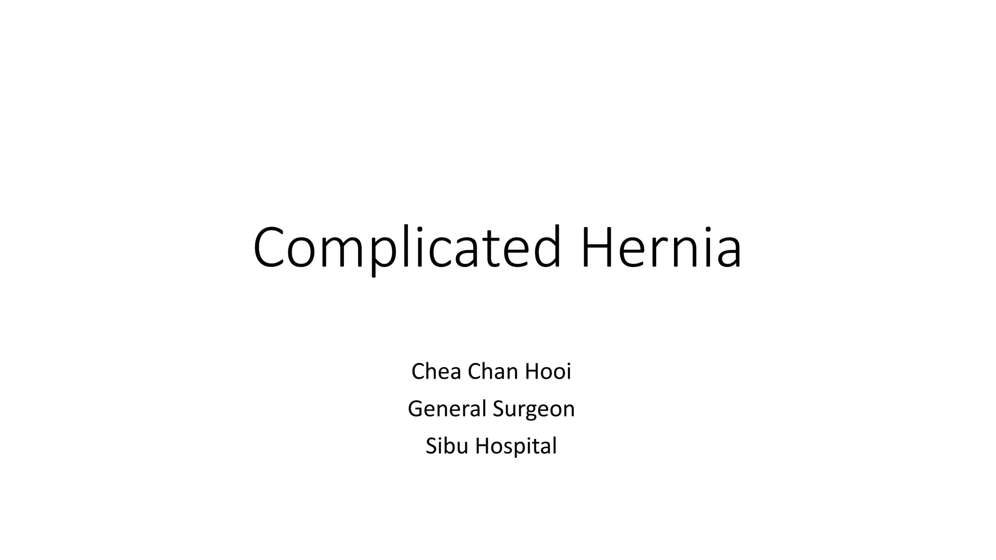 The document discusses complicated hernias, including their definition, epidemiology, classification, clinical presentation, investigations, and treatment options. It highlights the differing presentations and complications of groin hernias, including femoral and obturator hernias, and emphasizes the importance of surgical intervention in cases of obstruction or strangulation. The management of hernias involves careful investigation, resuscitation, and potentially laparoscopic or open surgical repair, particularly in emergency situations.