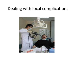 This document discusses potential complications that can arise from tooth extraction procedures. It outlines various local complications that can occur immediately, delayed, or late after an extraction. Immediate complications include failure of local anesthesia, inability to remove the tooth, fracture of tooth or surrounding bone, oro-antral communication, soft tissue displacement, hemorrhage, TMJ dislocation, and damage to nerves. Delayed complications involve pain, swelling, bleeding, dry socket, osteomyelitis, infection, oro-antral fistula, and failed socket healing. Late complications are chronic osteomyelitis, osteoradionecrosis, and nerve damage. The document provides details on causes and management of several specific complications.