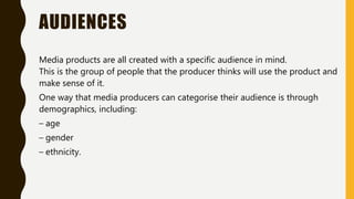 This document discusses audience demographics for various media products. It explains that media producers categorize their target audience by age, gender, and ethnicity to better understand who will consume their product. Several examples are given of how different media like BBC News, Frozen, and Call of Duty have different target demographics based on these categories. The document also includes a table for readers to fill in the age, gender, and ethnicity demographics for additional media examples.