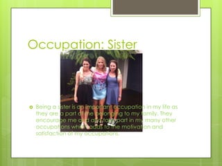 Baylee Townsend discusses several important occupations in her life including being a sister, friend, runner, sewer, cake decorator, cook, worker, student, netball player, and dancer. These occupations provide her with a sense of belonging, encouragement, motivation, life skills, fitness, and the opportunity to develop talents. They also allow her to socialize and make friends with others who share similar interests.