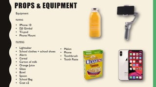 This document provides instructions and tasks for students to complete as part of their film production learning. It outlines developing film skills through experimentation, applying those skills by reimagining a trailer with pre-production, production, and post-production work, and reviewing what was learned. Students are given a mini-assignment to film scenes of a character running late for school in groups of 2-3, with requirements to complete pre-production paperwork like mindmaps, treatments, scripts, and storyboards.