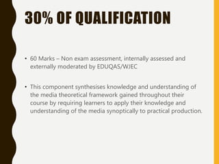 This document provides guidance and requirements for students completing the media production component of the course. Students must create either a 4-page magazine spread or 4-page film marketing materials. They must research an independent publisher or major film studio and target their work towards an audience of 18-34 year olds. Students will be assessed on their statement of aims, fulfilling the brief requirements, and use of media language to communicate meaning and representations. All work must be original and individually produced. Students receive guidance on planning, research, audience profiling, and production processes. A timeline is provided for completing tasks by the assignment deadlines.