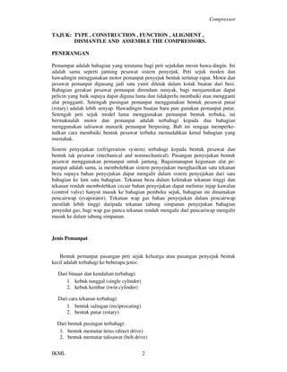 Dokumen ini menerangkan ciri-ciri dan fungsi pemampat dalam sistem penyejukan, termasuk jenis dan cara penggunaannya. Ia merangka pelbagai jenis pemampat seperti terbuka, semi-hermetik, dan hermetik, serta memperincikan cara pengoperasian setiap jenis. Juga dibincangkan adalah mekanisme gerakan dan pengawalan tekanan dalam sistem penyejukan untuk memastikan kecekapan dan keberkesanan pemampat.