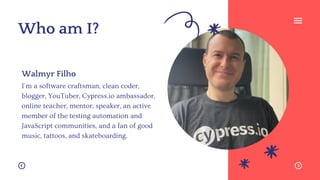 The document outlines component testing with Cypress, authored by Walmyr Filho, a software craftsman and Cypress ambassador. It covers the concepts of Cypress and component testing, installation, configuration, writing and running tests, and emphasizes that component testing complements end-to-end testing. Additionally, it includes hands-on exploration, continuous integration, and references for further learning.