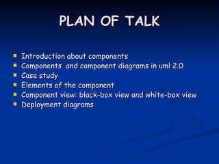 UML component diagrams describe the structure of software systems by showing components, their interfaces, and dependencies between components. A component represents a modular part of a system that encapsulates its contents and exposes its functionality through interfaces. Component diagrams show the organization and dependencies of components through their interfaces and ports using elements like components, interfaces, ports, and connectors. They allow modeling large and complex software systems in a modular way.
