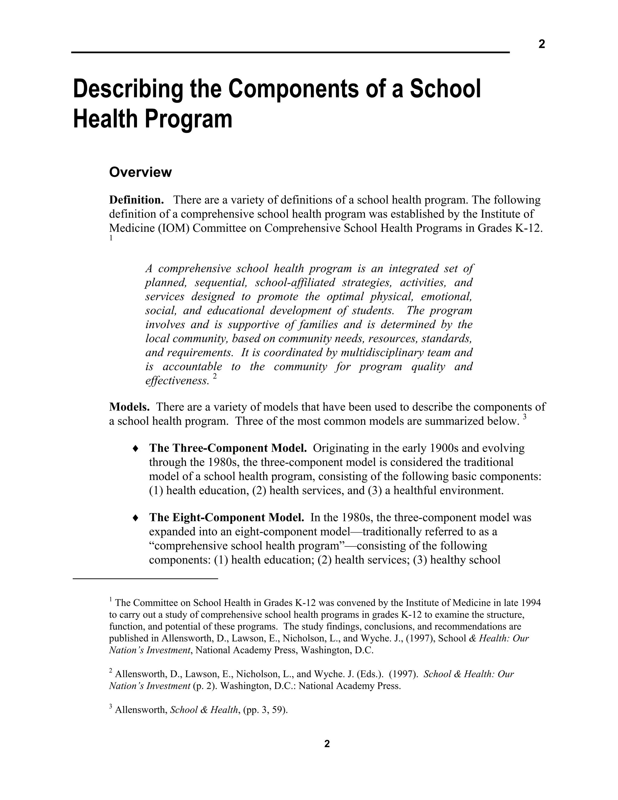 The document summarizes several models of school health programs, including the three-component model, eight-component model, and full-service schools model. It describes the key elements and features of each component in the different models. The three-component model includes health education, health services, and a healthful environment. The eight-component model, from the CDC, expands on this to include additional elements like physical education, nutrition services, counseling, and parent/community involvement. The full-service schools model envisions the school as a center providing a wide range of health, social, and family services through collaboration with community agencies.