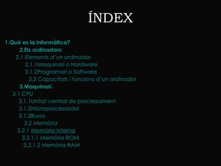 ÍNDEX 1.Què esla informàtica? 2.Els ordinadors: 2.1 Elements d’un ordinador 2.1.1Maquinari o Hardware 2.1.2Programari o Software 2.2 Capacitats i funcions d’un ordinador 3.Maquinari. 3.1 CPU 3.1.1Unitat central de processament 3.1.2Microprocessador 3.1.2Busos 3.2 Memòria 3.2.1 Memòria interna 3.2.1.1 Memòria ROM 3.2.1.2 Memòria RAM