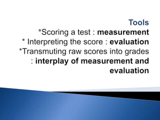 This document discusses assessment in education. It defines assessment as analyzing and determining the importance, amount, or value of learning outcomes for individuals or groups. Assessment includes testing and obtaining information relative to objectives or goals. It measures knowledge, skills, values, attitudes and various aspects of development. Measurement assigns quantities or scores to acquired traits while evaluation determines the quality or worth of achievements based on standards. Formative assessment gathers feedback during learning to improve instruction, while summative assessment measures learning after a unit. Assessment methods include selected response exams, performance tasks, portfolios, grading, and formative feedback through discussion monitoring.