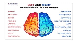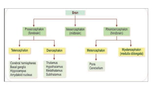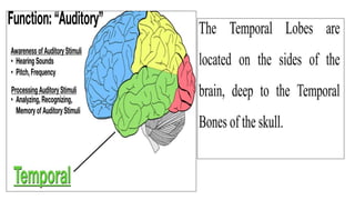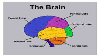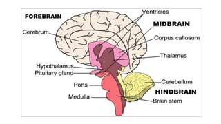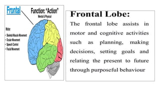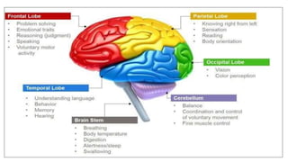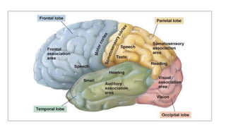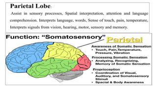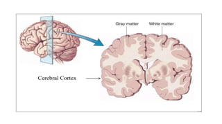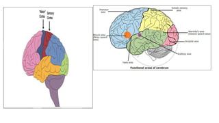 The document provides an overview of the central nervous system, detailing various brain regions including the cerebrum, cerebellum, brain stem, and spinal cord, along with their functions. It describes the roles of different lobes of the cerebrum such as the frontal, parietal, occipital, and temporal lobes in controlling cognition, sensory processing, and motor functions. Additionally, it highlights the structure of the spinal cord and its pathways for sensory and motor information.