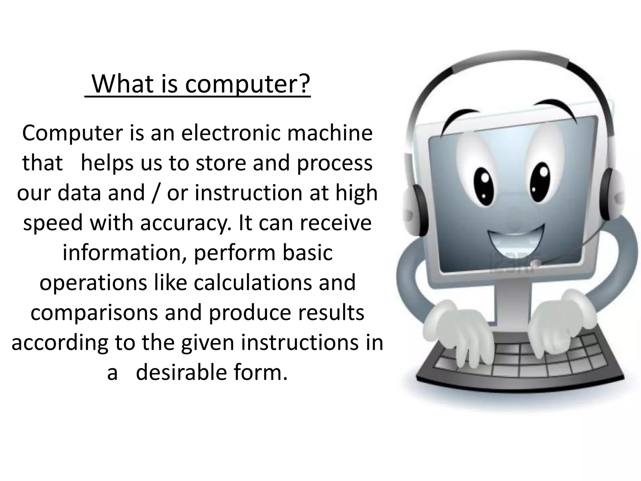 Computer is an electronic machine that helps store and process data and instructions at high speed and accuracy. It can receive information, perform basic operations like calculations, and produce results according to given instructions. Data is raw facts represented by symbols, while information is data arranged in a useful order. A computer's main components are the central processing unit (CPU), control unit, arithmetic logic unit (ALU), memory, and input/output units. Memory includes primary memory like RAM and ROM, and secondary memory like hard disks, which can permanently store large amounts of data.