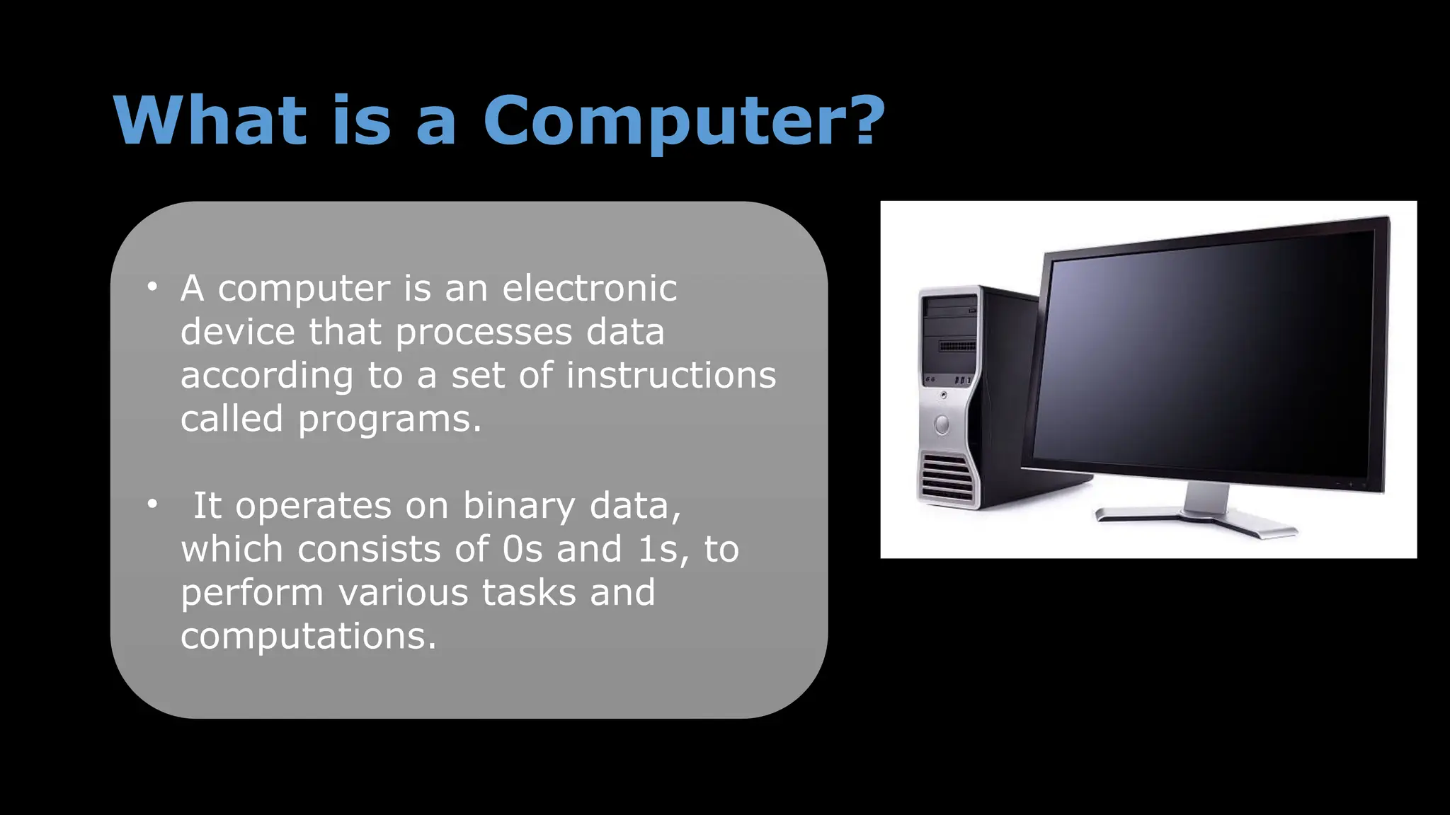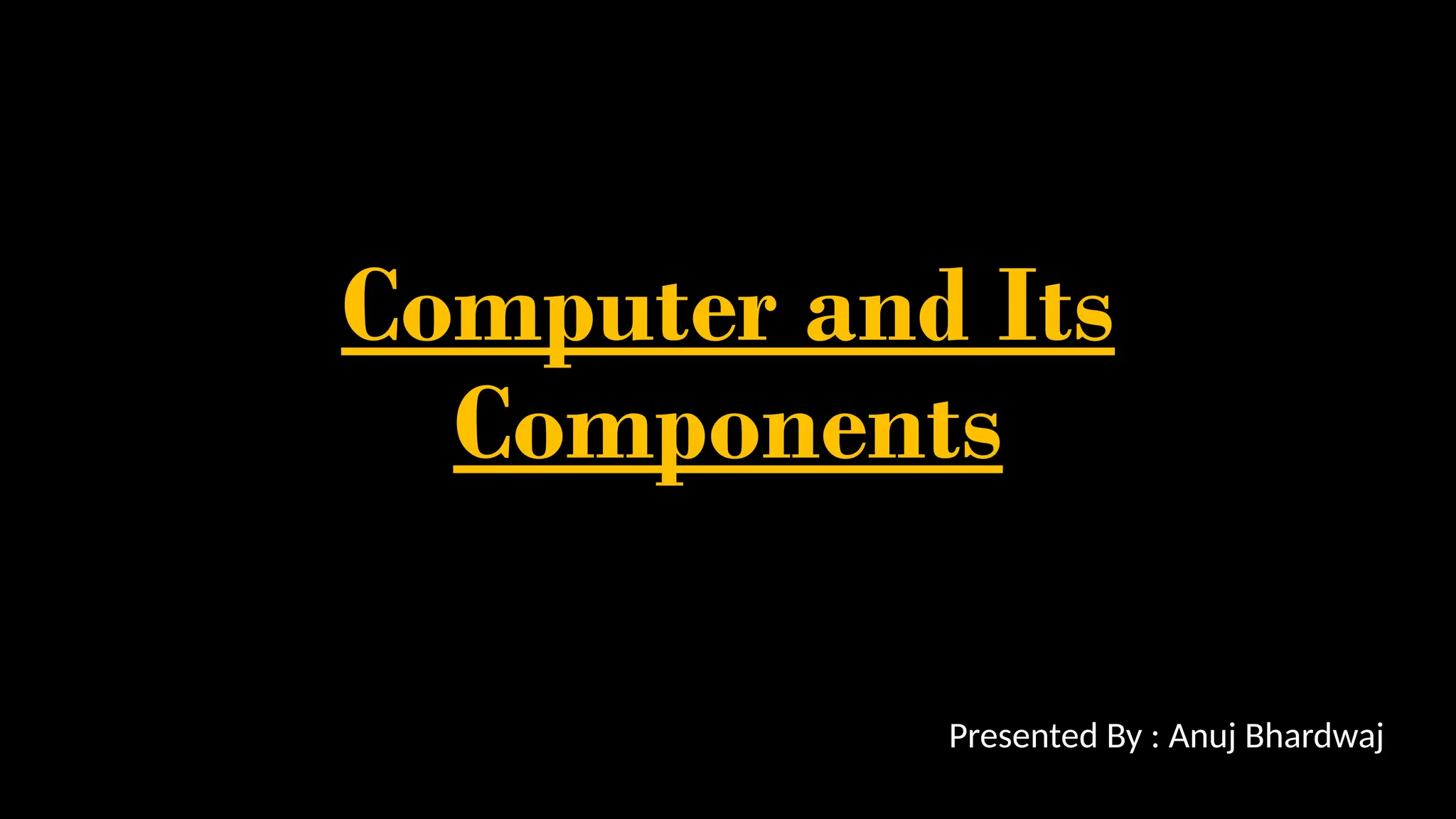A computer is an electronic device that processes data using programs and binary language. Its main components include the motherboard, input unit, CPU, GPU, RAM, and output unit, each serving specific functions in data processing and computation. The CPU, often referred to as the brain of the computer, manages the execution of instructions via its arithmetic logic unit, control unit, and memory registers.