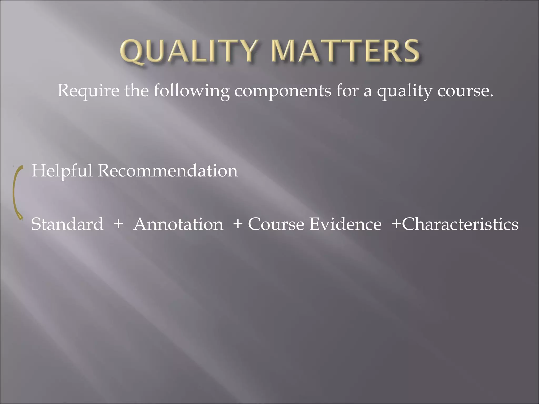 Rickey Warner's presentation outlined the key components required for a quality online course, including standards, recommendations, annotations, course evidence, and characteristics. It discussed the Quality Matters rubric which contains 8 general and 43 specific review standards. Annotations provide explanations of each standard along with examples from courses. Course evidence shows how standards are implemented, with location details and quotes. Characteristics for effective feedback include being constructive, specific, measurable, sensitive, and balanced. The goal is to train reviewers to evaluate if courses meet expectations and provide helpful feedback to improve learning.