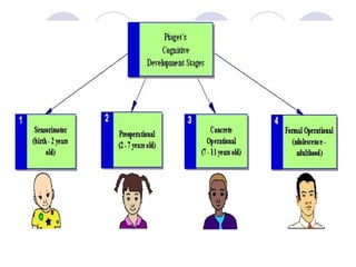 - Cognitive development theory by Piaget which includes sensorimotor, preoperational, concrete operational, and formal operational stages.