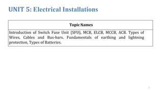 - It describes the working and construction of fuses, MCBs, MCCBs, ELCBs, and air circuit breakers.