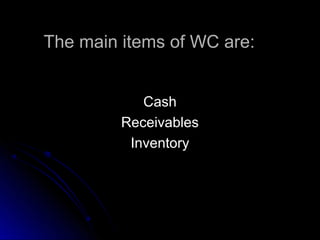 The main components of working capital are cash, receivables, and inventory. Cash is the most liquid current asset and includes funds held in bank accounts. Firms hold cash for transactional, precautionary, and speculative motives. The objectives of cash management are to maintain an optimal cash balance to meet payment obligations while minimizing costs. Common cash management strategies involve maintaining minimum cash levels, controlling cash inflows and outflows, and investing cash surpluses. Proper inventory management also aims to balance holding sufficient stock without excessive investment.