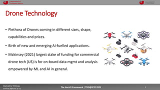 The document presents the Hornet framework, designed for composable energy modeling of ML-driven drone applications. It discusses the challenges of energy consumption in drones and provides methods for profiling and monitoring energy use during various operational scenarios, particularly in relation to on-board machine learning tasks. The framework aims to assist machine learning practitioners in optimizing energy efficiency while running algorithms on resource-constrained drones.