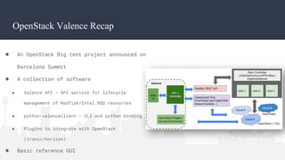 OpenStack Valence is a project focused on lifecycle management of Intel Rack Scale Design (RSD) resources, featuring APIs and plugins for integration with OpenStack components. It includes a reference GUI and supports advanced deployment scenarios, such as elastic bare metal provisioning and dynamic NVMe storage provisioning. Next steps involve developing a generic pod manager and extending communication capabilities with the RSD-managed hardware.