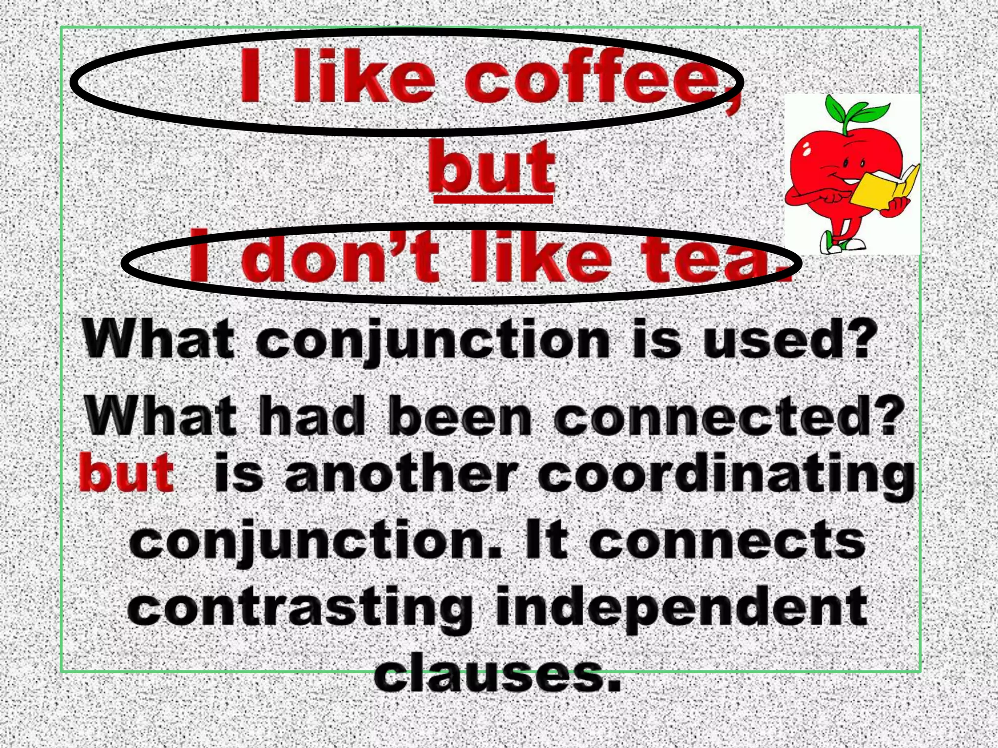 This document discusses coordinating conjunctions and their purposes in sentences. It lists the coordinating conjunctions "and", "but", "yet", "or", "so", and "nor" and explains that they are used to connect ideas showing addition, contrast, choices, reason/cause, and negative choices respectively. It provides two example sentences, one using "nor" and one using "yet", to illustrate their uses in connecting different types of ideas.