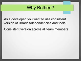 Composer is a dependency manager for PHP projects that allows developers to declare and install dependencies and their versions. It guarantees consistency across team members and environments by locking dependency versions in a composer.lock file. To use Composer, a project's dependencies are defined in a composer.json file. Running "composer install" will install all dependencies into the vendor folder from the versions specified in composer.lock. Composer can be used with frameworks like Drupal and WordPress to manage their core files and dependencies.