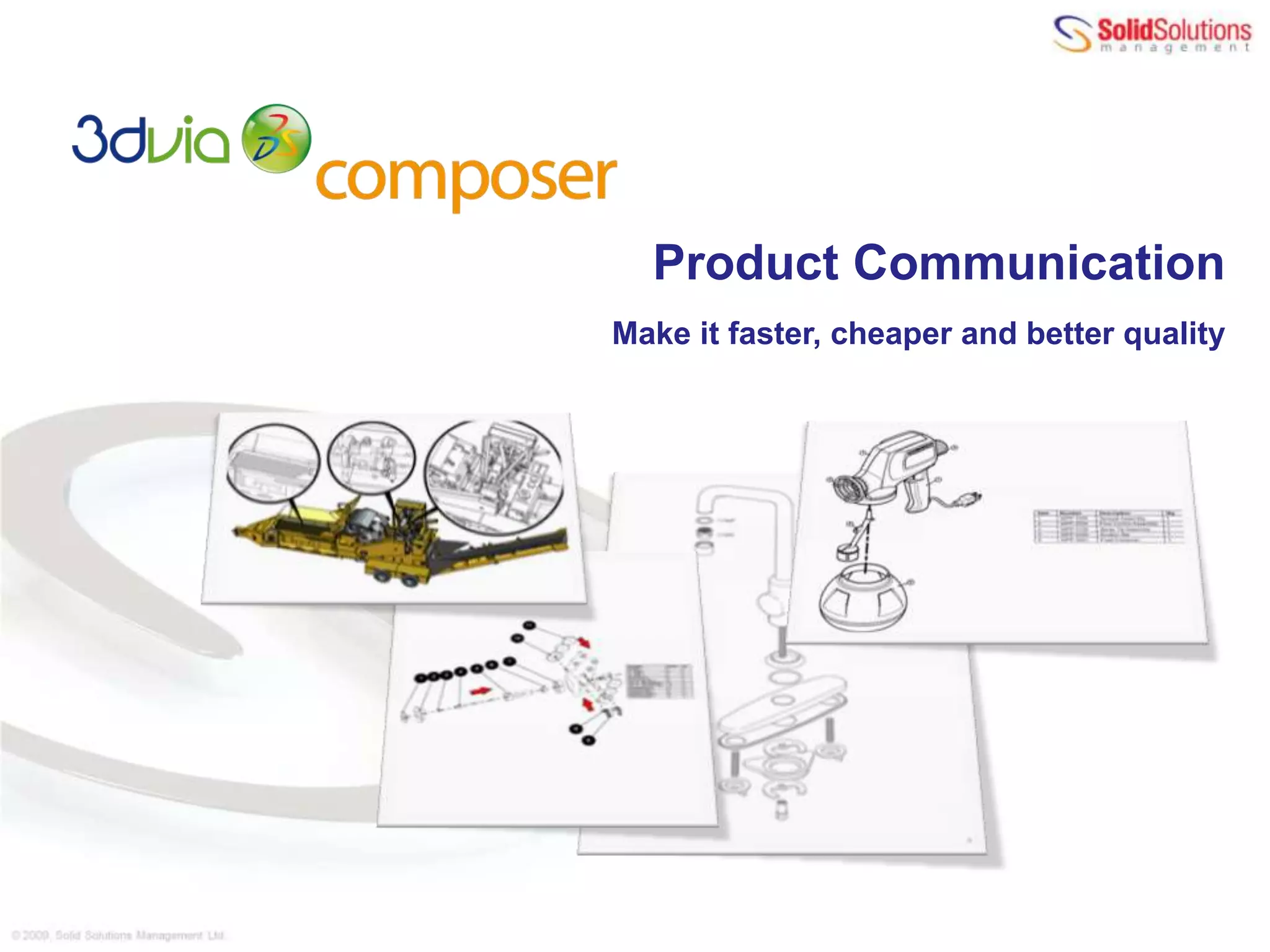 The document discusses how 3DVIA Composer can be used to create technical documentation and communications deliverables like assembly instructions, manuals, and marketing materials. 3DVIA Composer allows users to reuse 3D CAD data to generate high-quality visual assets, illustrations, and interactive content. This helps streamline documentation processes, lower costs and time to market by reducing rework compared to traditional documentation methods. The webcast demonstrates the capabilities of 3DVIA Composer for quickly creating technical publications, manuals, illustrations and animations from CAD models.