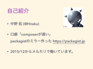(@Hiraku) • 口癖「composerが遅い」 packagistのミラー作った https://packagist.jp • 2015/12からメルカリで働いています。