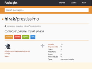 prestissimoとは • composerプラグイン。globalインストールすることで以下の機能を付与する • curl_multiでの並列zipダウンロード。並列数はカスタマイズ可能 プラグイン側で先に並列ダウンロードしてキャッシュを暖める •