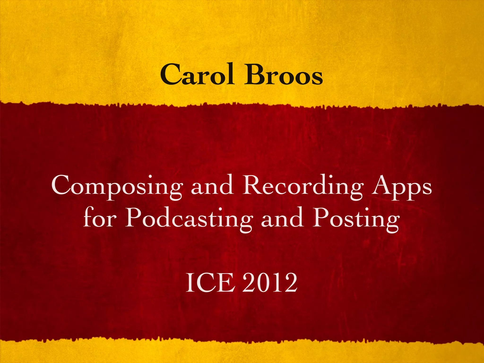 The document discusses various apps that can be used for composing, recording, and posting music and podcasts. It provides information on apps for the laptop and iPad, including apps for composition, notation viewing, recording, interactive music, and posting creations. It also briefly discusses current trends in education like Skype in Schools, global education initiatives, and flipped classrooms.