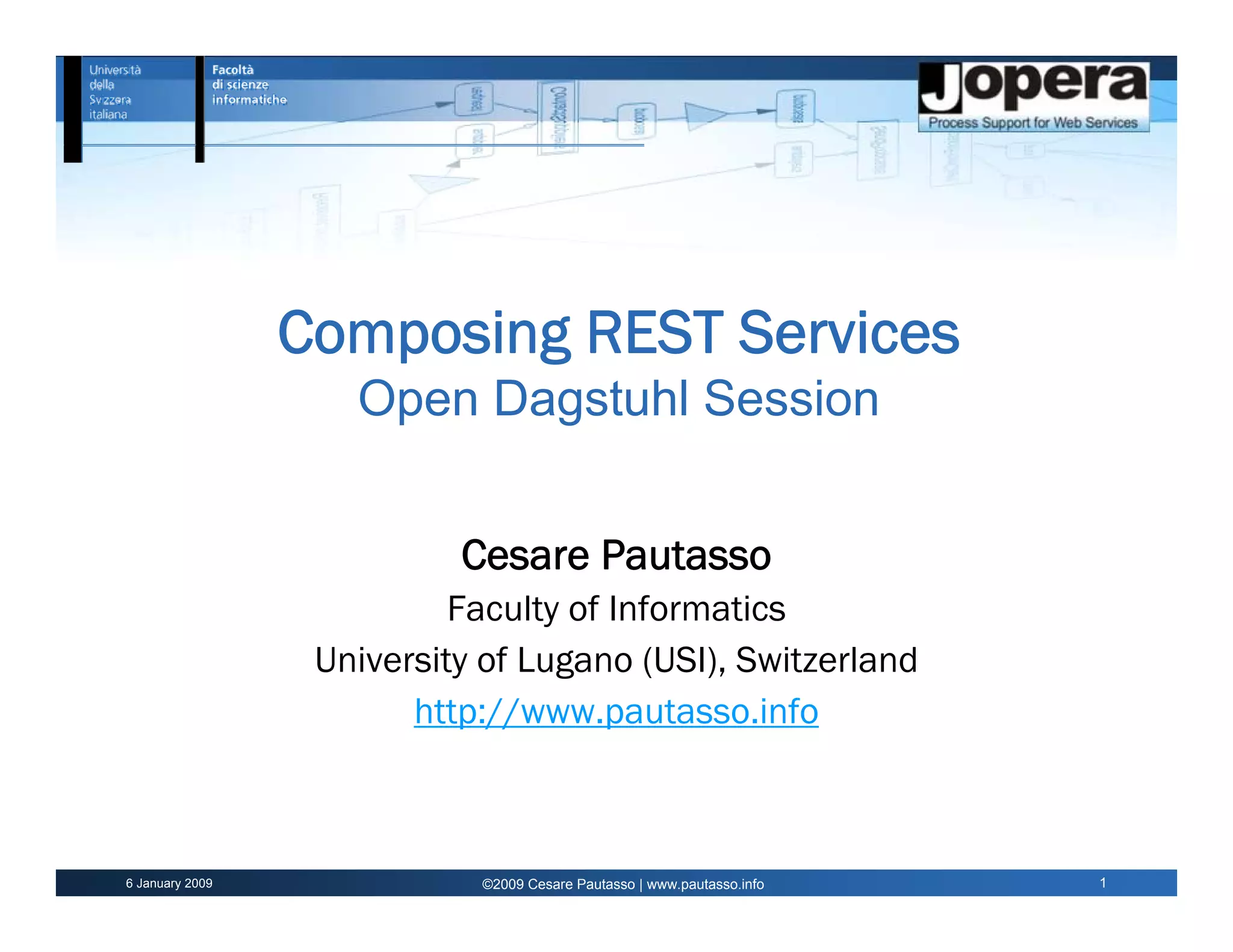 Cesare Pautasso discusses composing RESTful web services using business process modeling languages. There are three main solutions proposed: 1) using an abstract workflow that is independent of invocation technology, 2) making REST interactions explicit constructs in workflow languages, and 3) modeling workflows as resources that are accessed via RESTful interfaces. Pautasso argues that workflow engines should support composing both RESTful and WS-* web services, and that representing workflows as resources accessed via standard REST operations is a promising approach.