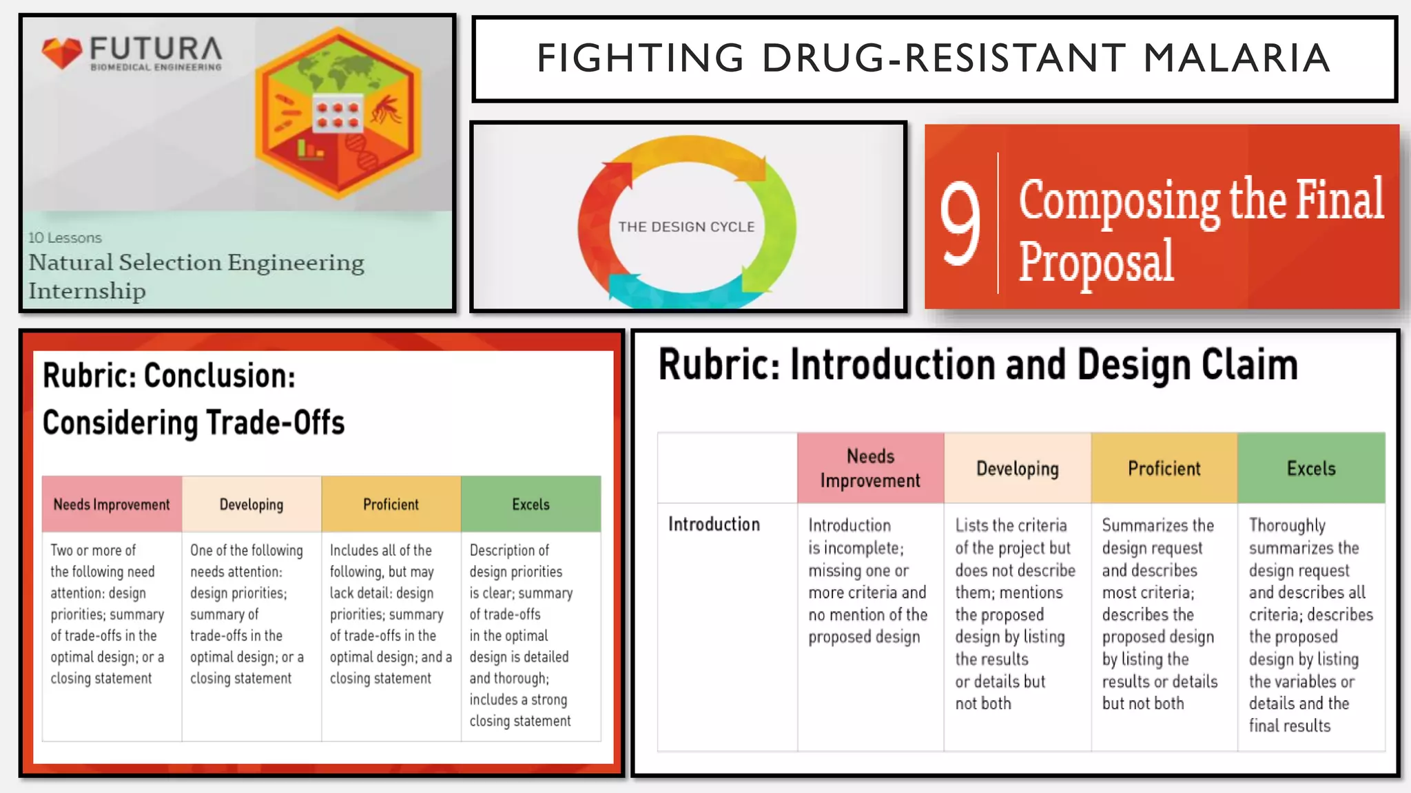 This document provides instructions for interns to complete and submit their final malaria treatment proposal. It guides them through writing an introduction paragraph by copying relevant information from their project summary. It then instructs them to state their design claim by describing the key aspects of the proposed treatment design. For the conclusion, interns are told to summarize why their design should be chosen, describe their design priorities and the trade-offs between criteria, and convince the reader their design is optimal despite the trade-offs. The document also reviews revising the entire proposal, including the three design decision paragraphs, before submitting.
