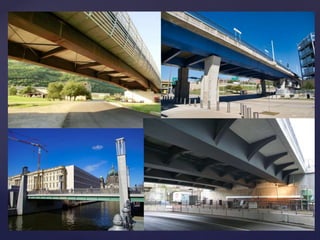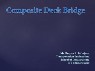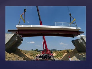 The document discusses composite bridge structures where steel beams are integrated with concrete decks using shear connectors, enhancing strength and reducing deflections. These structures are efficient, lightweight, and earthquake-resistant, but have a high initial cost and can be temperature sensitive. Challenges include handling during fabrication and the need for maintenance and material replacement due to damage.